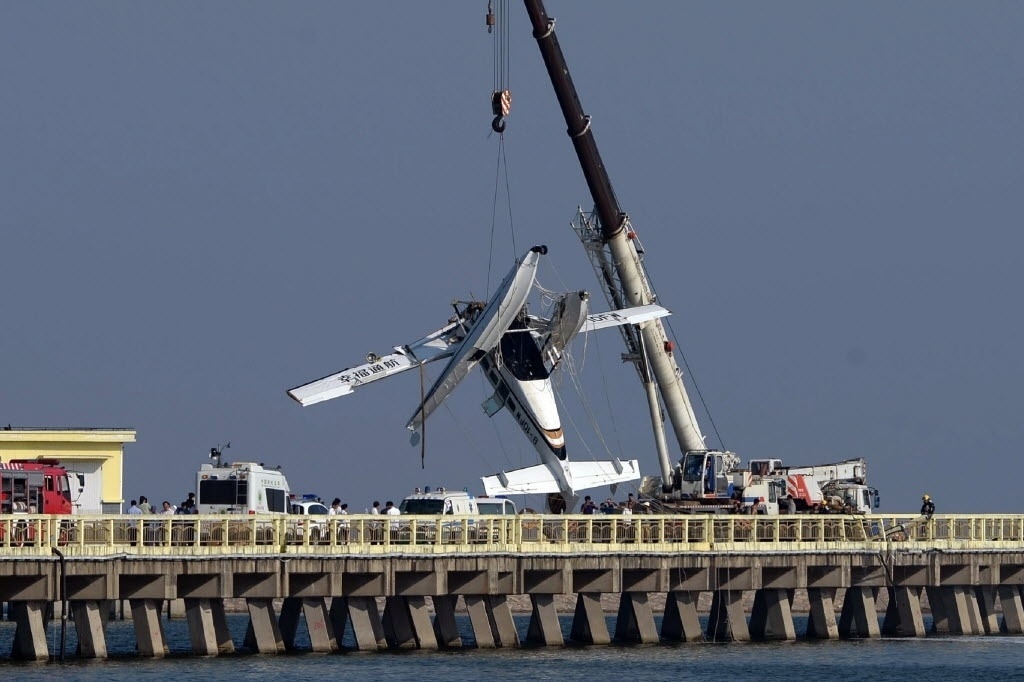 20.jul.2016 - Um guindaste levanta o hidroavião que bateu em uma ponte da estrada em Jinshan, Xangai, na China. De acordo com a imprensa local, ao menos cinco pessoas morreram no acidente, que aconteceu cerca de dez minutos depois da decolagem em uma praia durante o voo inaugural do avião anfíbioImagem: AFP